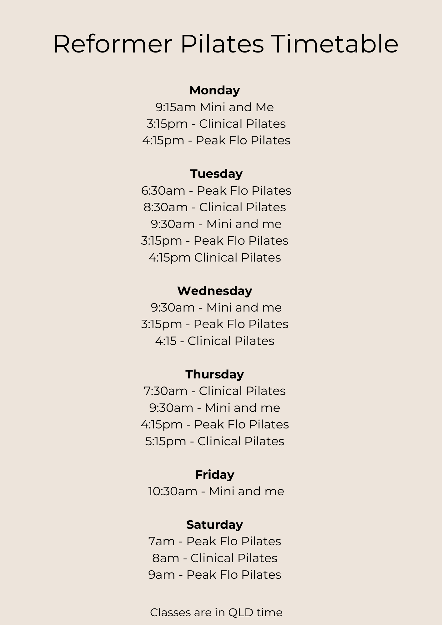 Each class is structured around a series of low-impact exercises designed to improve strength, flexibility, and posture. Our Mini and Me and Peak Flo Pilates classes include modifications to support postnatal recovery or pregnancy, with a focus on pelvic floor, core, and overall body health. We work with reformers and other Pilates equipment to enhance your experience.